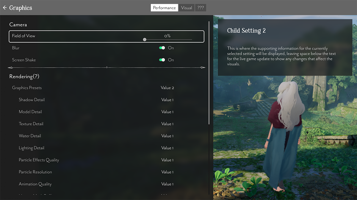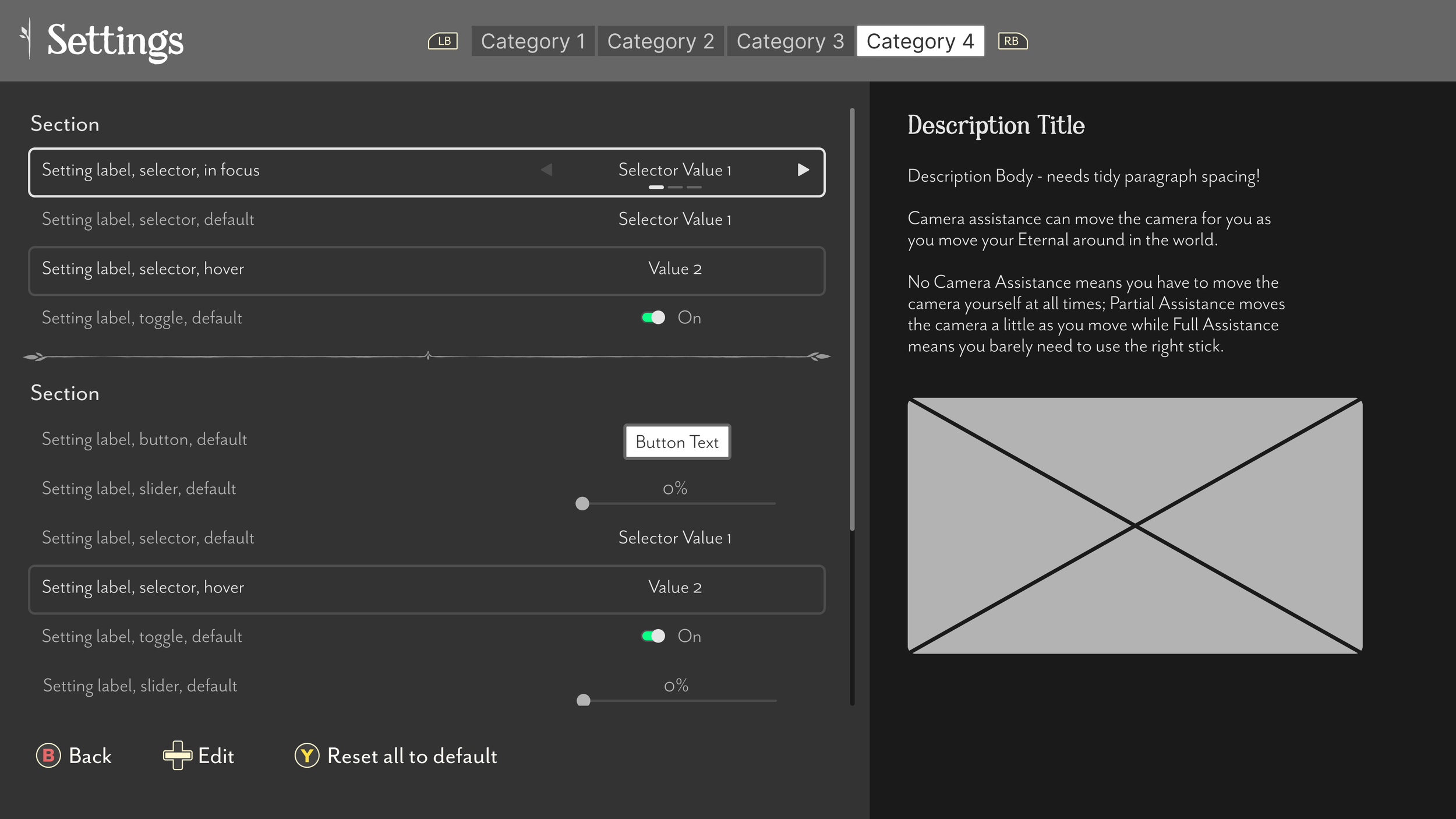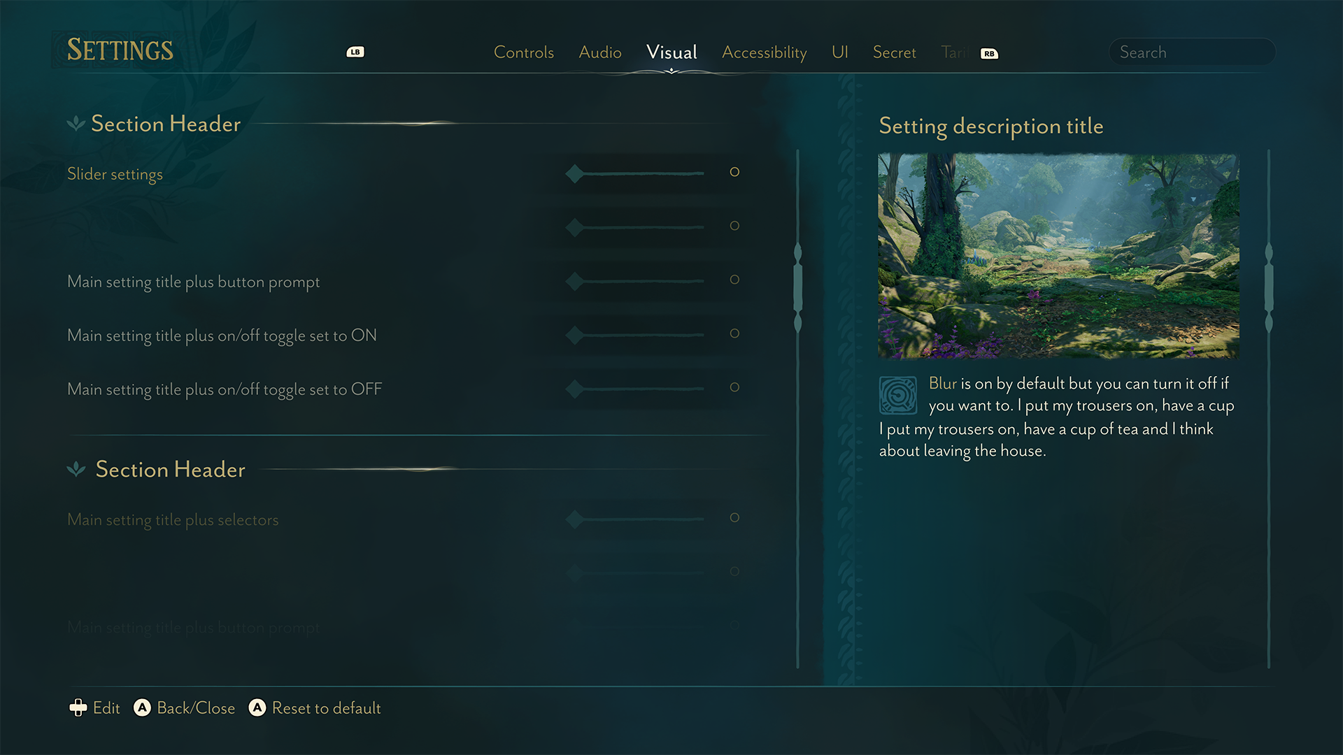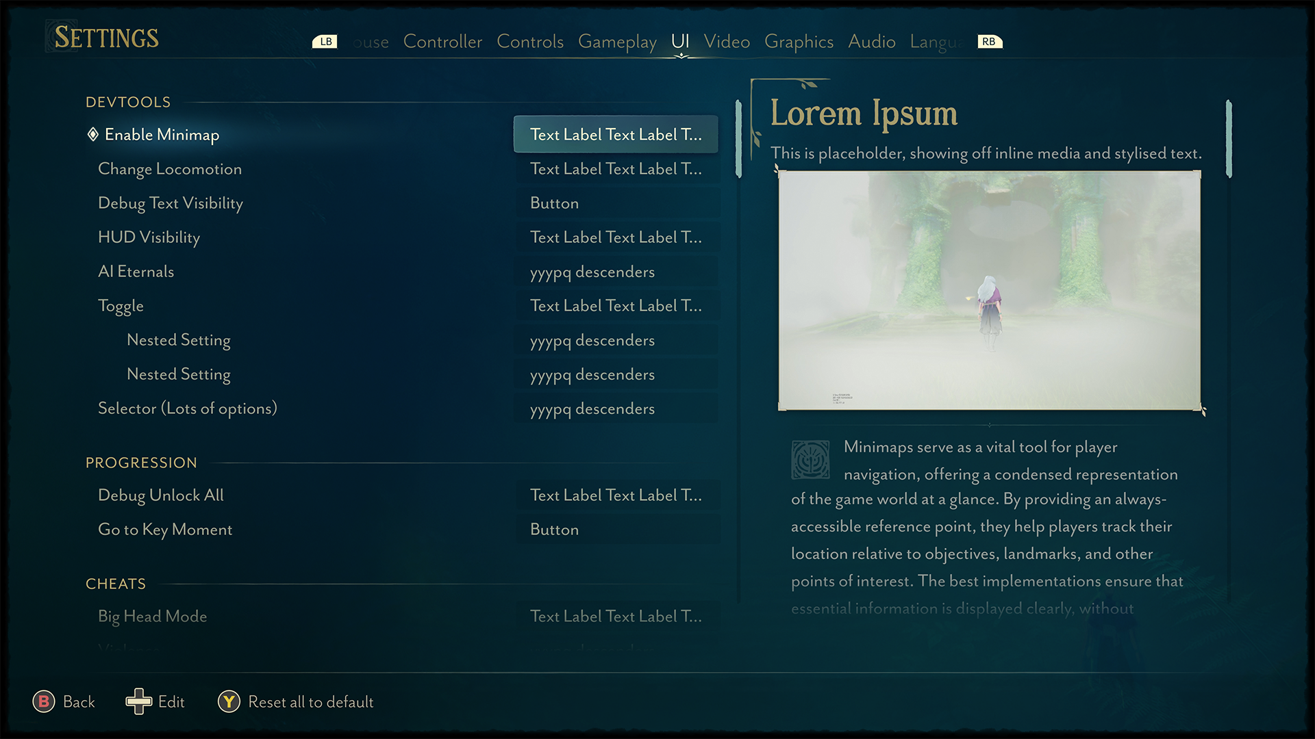 We planned for Everwild to have a set of controls for players to adjust the first time they play, but we needed to start with a full suite of settings controls.
