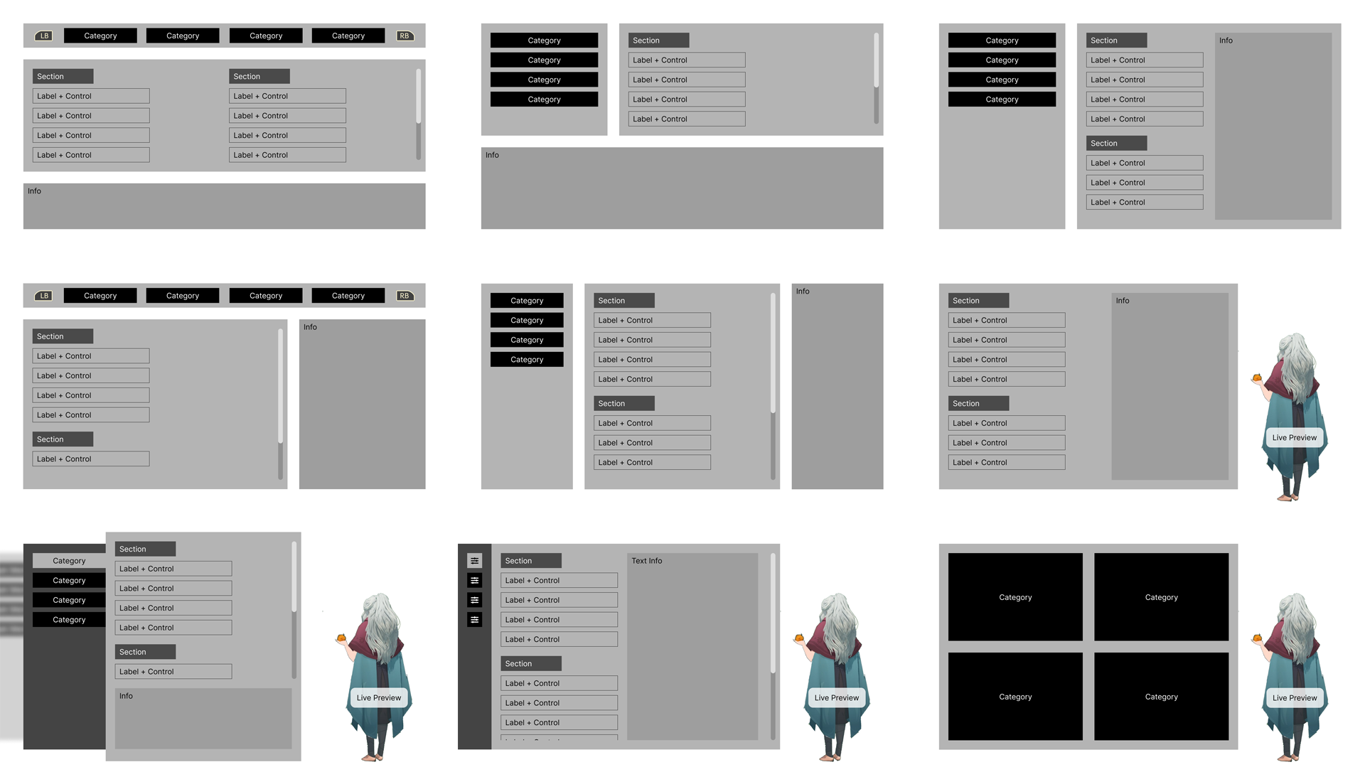 The images show various stages of iteration of the Settings system we proposed: some early layout sketches; a more refined UX mock-up; an early code pass; two polished UI artwork versions (by Wil Overton and Sean McNulty respectively).